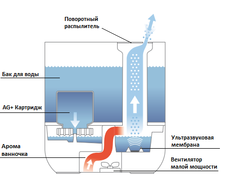 Внутри увлажнителя U200 установлена мембрана, которая после включения прибора начинает вибрировать в ультразвуковом диапазоне частот. В результате колебаний на поверхности воды образуется "туман" из мелких капель воды. Вентилятор, установленный внутри увлажнителя, выдувает образовавшееся облако в помещение (капли воды имеют сверх малый объем, поэтому они моментально превращаются в пар и таким образом насыщают воздух влагой). При низком уровне воды прибор отключается, а подсветка окна резервуара загорится красным цветом, напоминая о том, что бак необходимо пополнить.