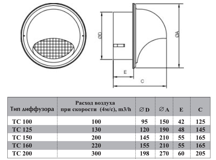Вытяжные диффузоры изготовлены из нержавеющей стали № 304, представляют собой потолочные воздухораспределительные элементы: ТС с решёткой, TC-G с решёткой и сеткой.