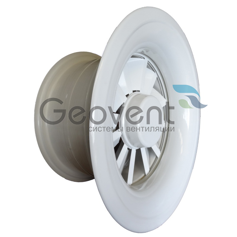 Внешняя панель диффузора включает в себя круглую панель со встроенным соплом, лопатки для воздухораздачи (регулируемые или неподвижные), закрывающие центр декоративного колпачка и соединительный патрубок. Положение лопаток может изменяться либо вручную, либо при помощи электропривода. Лопатки изготавливаются из стали или из алюминия и имеют специальную антивибрационную прокладку. Монтажное кольцо имеет фланцевое соединение. По заказу клиентов можем разработать и изготовить другие размеры диффузора SVR.