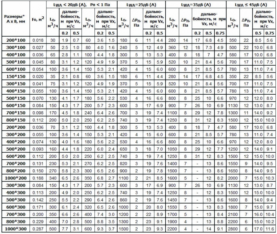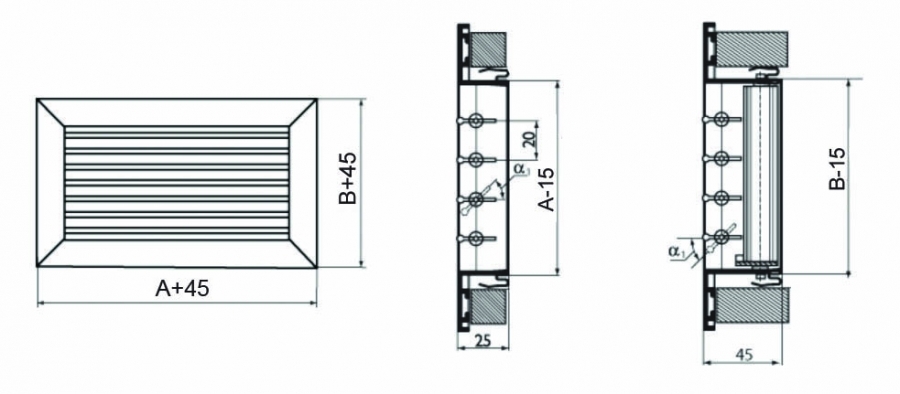 Однорядные вентиляционные решетки изготовлены из алюминия и снабжены индивидуально регулируемыми жалюзи для изменения направления и (или) характеристик приточной струи. Жалюзи устанавливаются в пластиковые втулки, которые облегчают их поворот при регулировании. Настенный монтаж вентиляционной решетки производится с помощью пружинных фиксаторов. Потолочный монтаж рекомендуется производить с помощью самонарезающих винтов. Решетки вентиляционные окрашиваются методом порошкового напыления в белый цвет (RAL 9016). При изготовлении вентиляционных решеток на заказ возможна окраска в любой цвет по каталогу RAL. Помимо потолочного и настенного монтажа, настенные решетки используют так же и при монтаже на подоконнике. Минимальный размер вентиляционной решетки 100 x 100 мм, максимальный 1200 мм по одной из сторон, шаг 50 мм, также возможно изготовление под заказ решеток с нестандартным шагом. При размере А (В) > 500 мм устанавливается перемычка для обеспечения прочности конструкции.